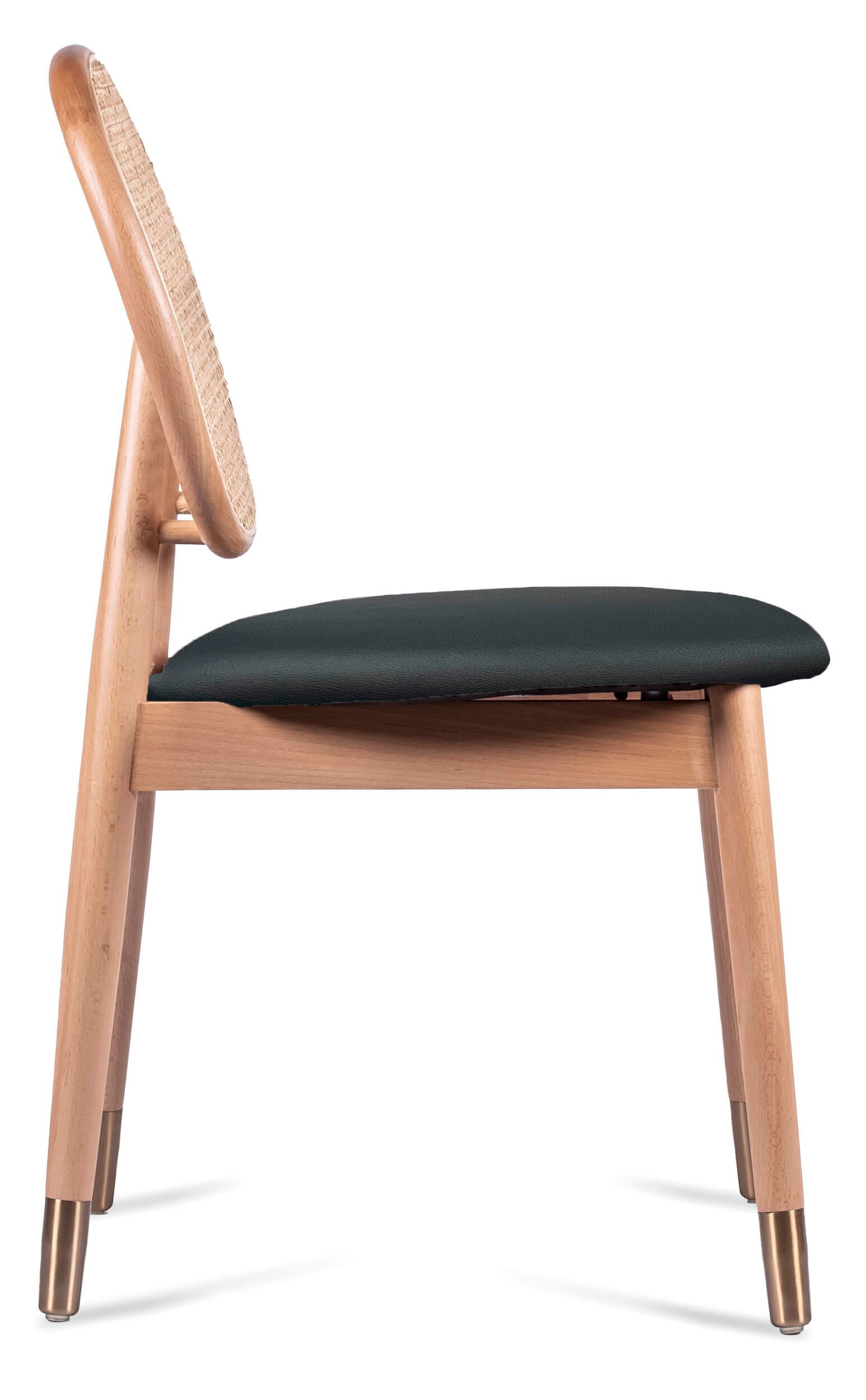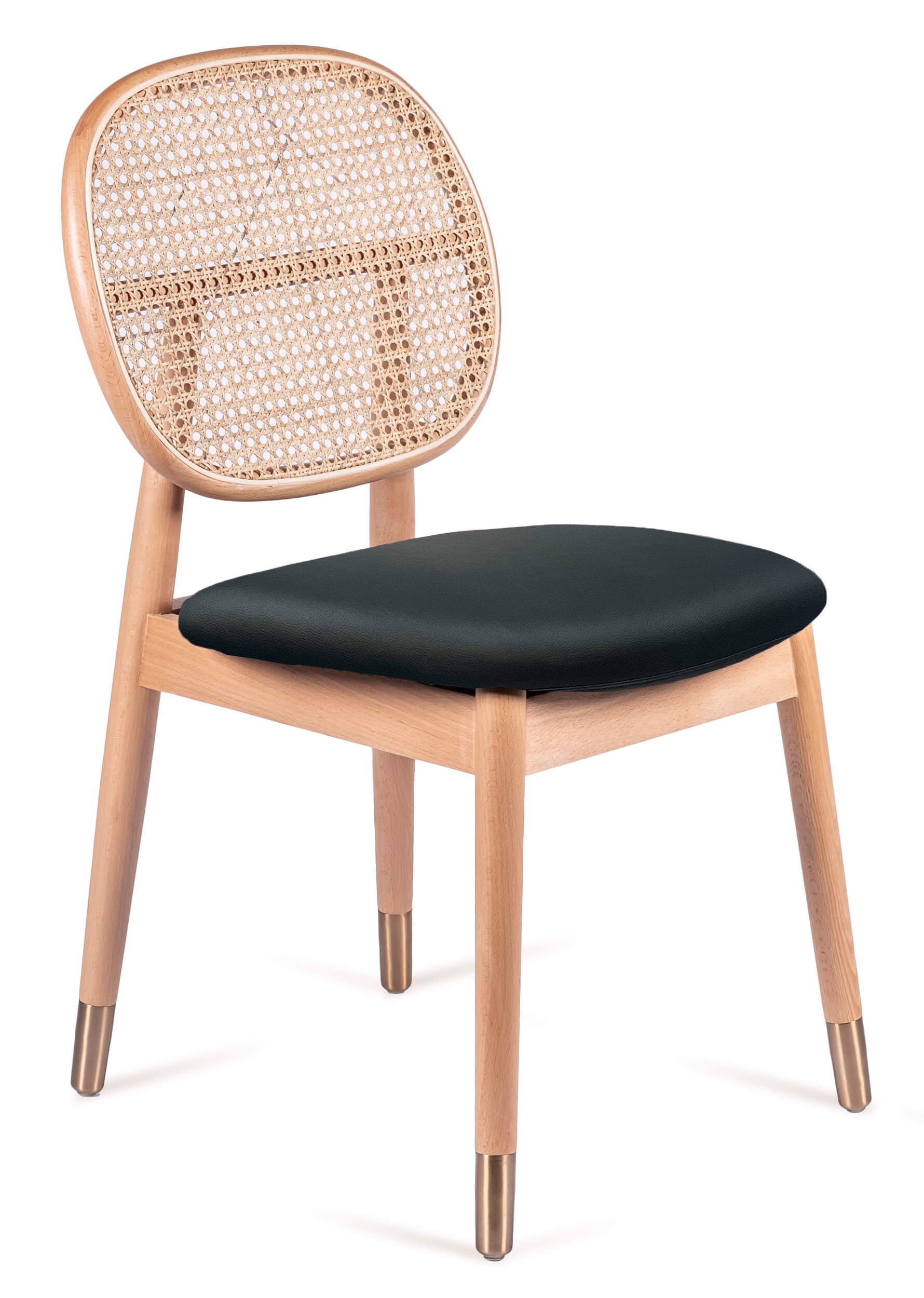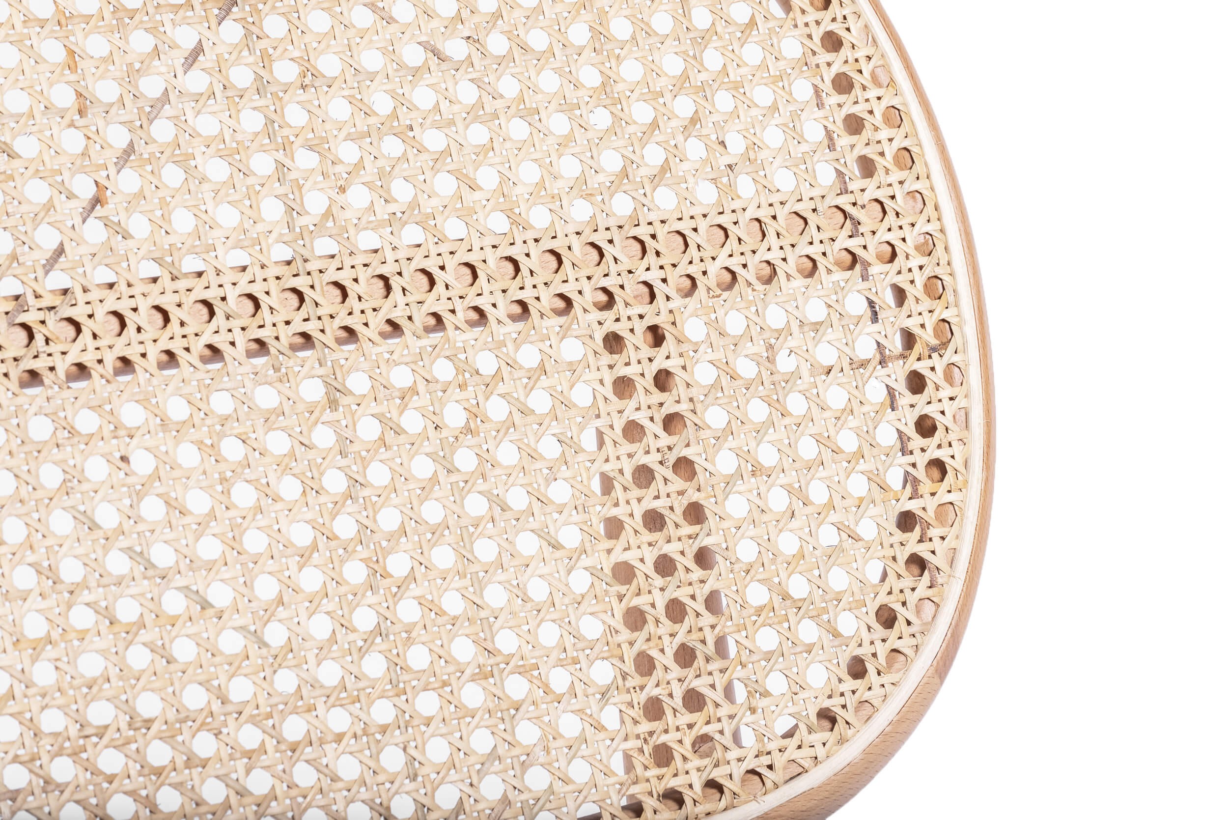 Die Kanten der Sitzfläche und der Rückenlehne bestehen aus lackiertem Buchenholz, was für Haltbarkeit und Festigkeit sorgt. Der Innenraum besteht aus widerstandsfähigem und sehr leichtem Naturrattan, was dieses Produkt zu einem echten Hingucker macht. Es wird von einem Lederkissen begleitet, das für mehr Komfort sorgt.
