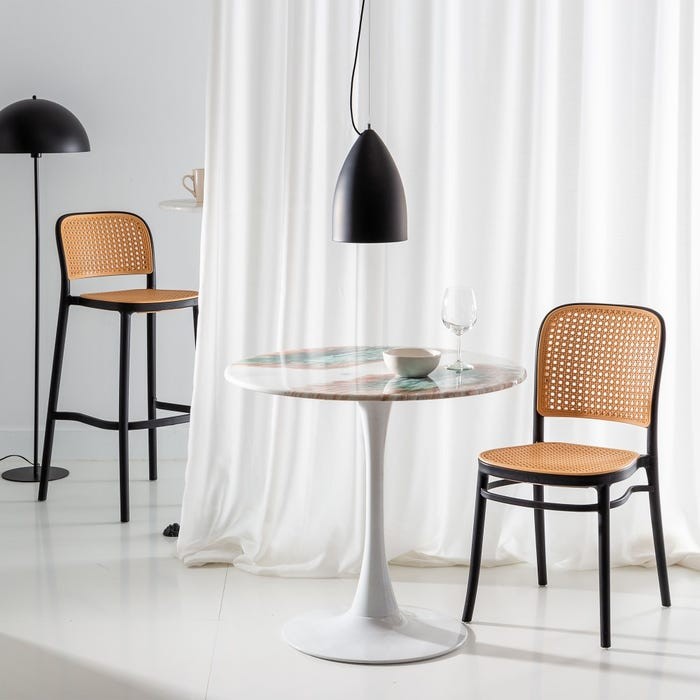 Se on ihanteellinen ulko- ja sisäkäyttöön, koska sen rakenne on valmistettu polypropeenimuovista ja istuin synteettisestä rottinkista. Ihanteellinen keittiöön, baaritiskiin, ravintoloihin ja ulkotiloihin.