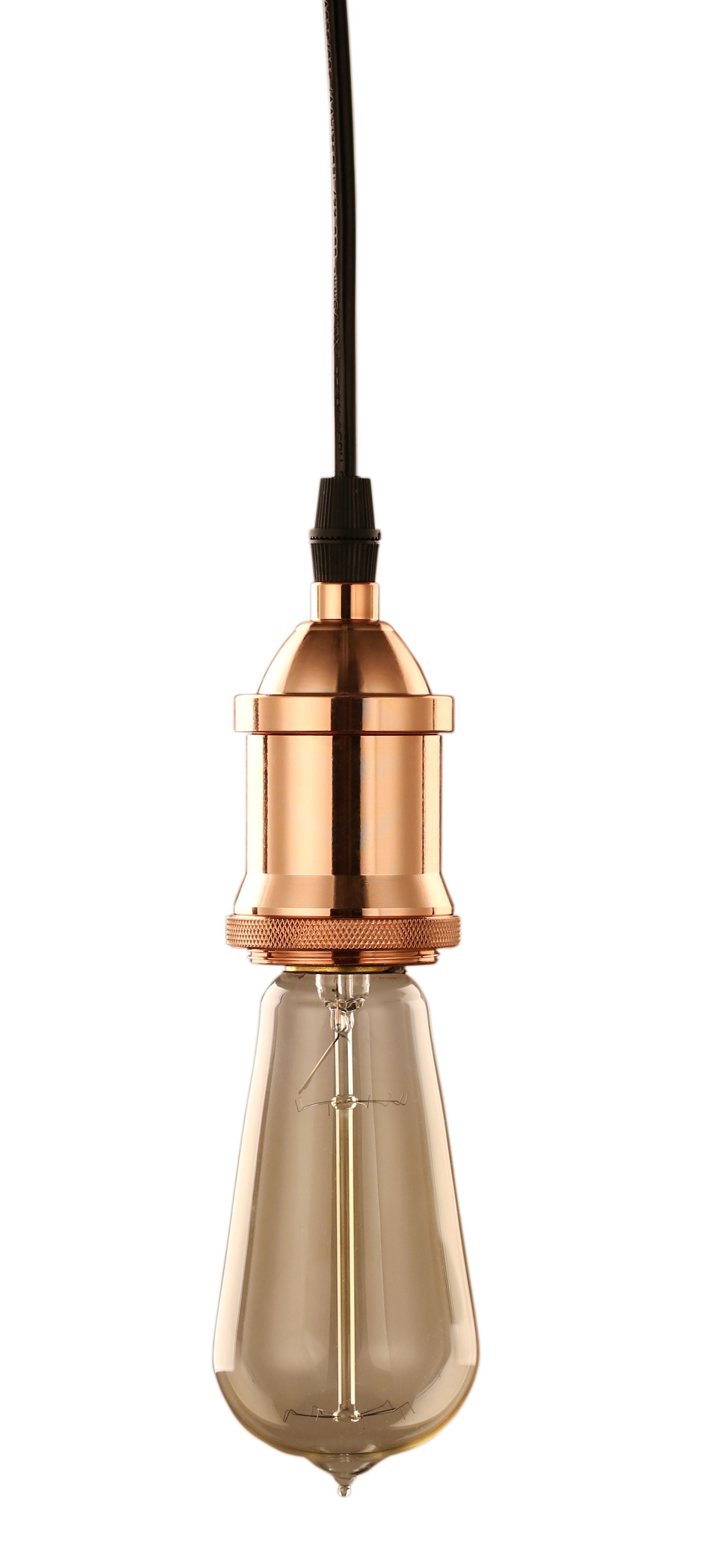 - Hanglamp met blanke gloeilamp, koperkleurige aluminium fitting en zwarte kabel.